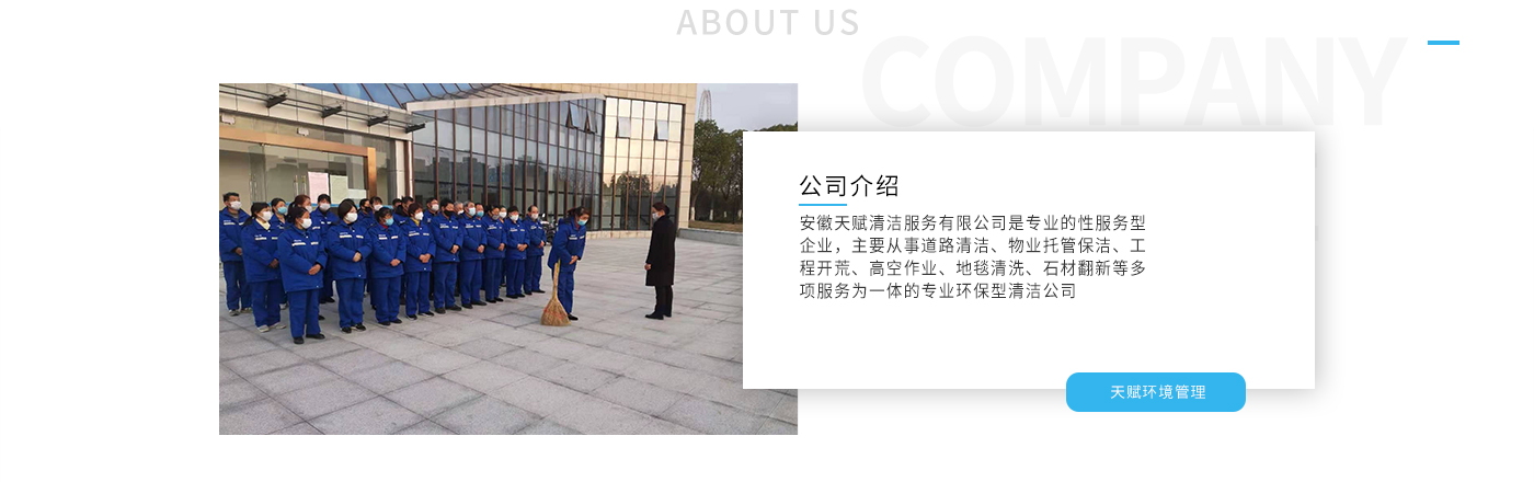 安徽天賦清潔服務(wù)有限公司是的服務(wù)型企業(yè),主要從事道路清潔、物業(yè)托管保潔、工程開荒、高空作業(yè)、地毯清洗、石材翻新等多項服務(wù)為一體的環(huán)保型清潔公司。公司管理機(jī)制完善,清潔作業(yè)經(jīng)驗豐富,擁有技術(shù)力量,嚴(yán)格實行崗前培訓(xùn)—崗中督查—上崗在培訓(xùn)的員工管理措施,憑著優(yōu)良的清潔質(zhì)量和嚴(yán)格的督查管理,為眾多企事業(yè)單位、醫(yī)院、酒店、廠區(qū)商場、物業(yè)、道路、學(xué)校、公園等提供后勤清潔服務(wù)。在業(yè)內(nèi)擁有良好的口碑。工作人員,服務(wù)態(tài)度優(yōu),竭力為客戶提供好的保潔服務(wù)。安徽天賦清潔服務(wù)有限公司:致力于長期合作關(guān)系,提高服務(wù)質(zhì)量,提供高標(biāo)準(zhǔn)的清潔服務(wù)。公司的經(jīng)營理念:為營造一個更清潔、亮麗的生活和工作環(huán)境而努力!“誠信”是公司成功保證?!翱蛻糁辽?,信譽(yù)為首”是公司宗旨。高標(biāo)準(zhǔn)提供服務(wù),維護(hù)客戶利益、形象,是我始終不渝的目標(biāo)。